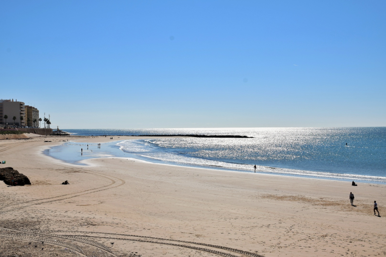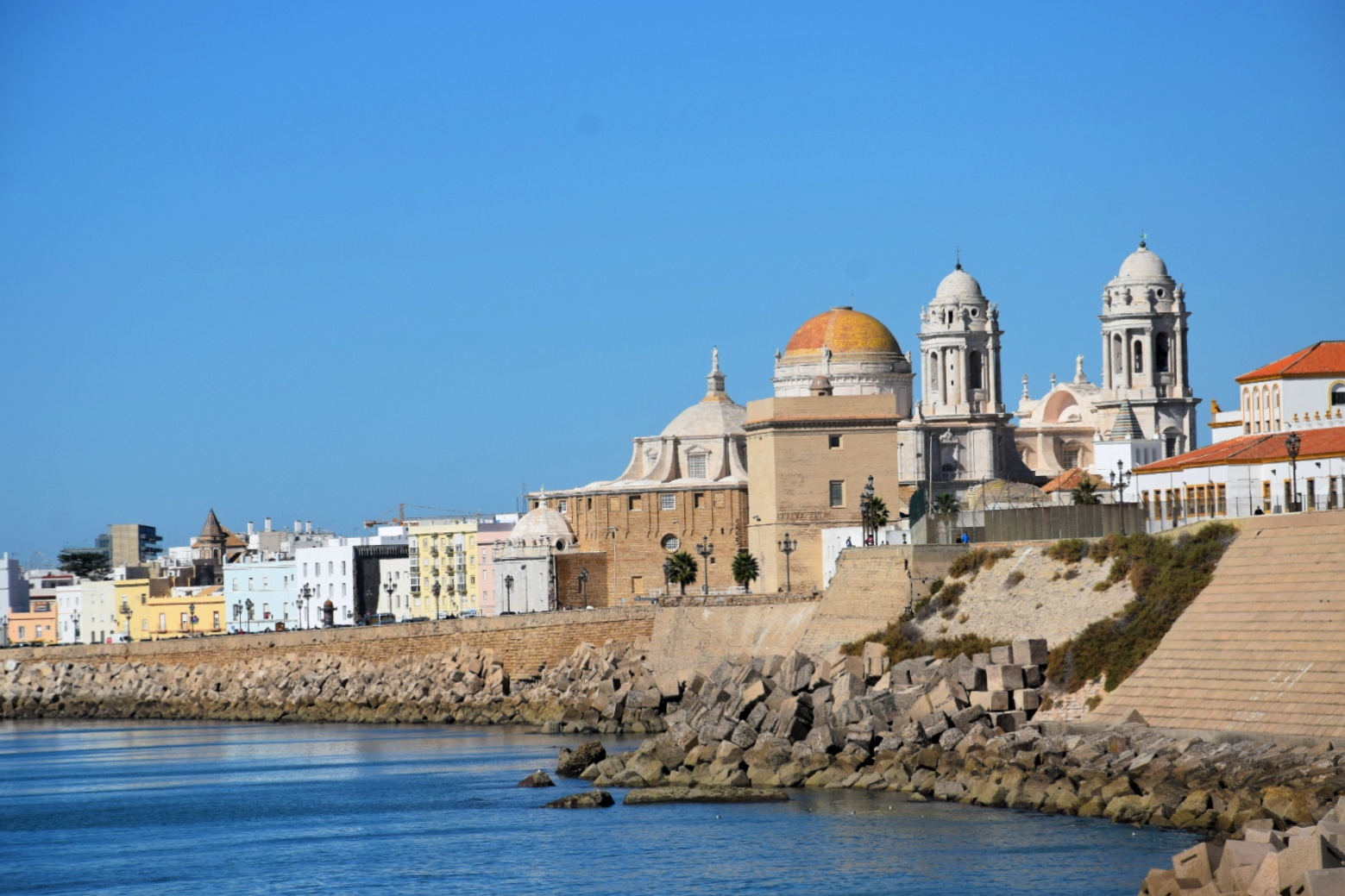 Cadiz iebraucām šķērsojot vājprātīgu vanšu tiltu. Milzīgi garu, augstu un šķībi izliektu, kas no tāluma izskatījās nereāli biedējoši. Pati pilsētiņa, atkal pilnīgi citādāka ar brīnišķīgu promenādi pašā okeāna krastā. Nolēmām aizdoties līdz tādam kā mini molam un saprotot, cik fantastiski silts un patīkams laiks bija, izlēmām nedaudz pasauļoties. Par brīnumu tam, ka ir novembris un vietējie vairāk vai mazāk apgalvo, ka ir auksts, nebijām vienīgie pludmalē. Vairāki spāņi baudīja saules starus tā pat kā mēs. Varbūt tie arī bija tūristi? Nop, nav iespējams, jo pārējie bija skaisti brūni un pat melni iedeguši, bet mēs – kā balti palagi, uz kuriem visi vecie opji aktīvi skatījās. Piedzīvojām arī peldi okeānā, kas bija fan-tas-tis-ka! Ūdens dzidrs, atvēsinošs un nereāli sāļš. Krastā bija palikusi draudzenes mamma, kas, kā redzējām no ūdens, kaut ko aktīvi vicinoties runāja ar vietējo sievieti. To pašu vietējo – vecāka gadagājuma kundzi, kas bija tāda ļoti bez kompleksiem. Kad tikko bijām atnākuši un viņas suns mums bija pieskrējis klāt, kundzīte, ģērbusies vien šaurās apenītēs, to lamāja tik izjusti un ekspresīvi, ka viņas kailās krūtis šūpojās no vienas puses uz otru. 😀 Šajā reizē viņa draudzenes mammu brīdināja, ka tuvojas paisums un ūdens līmenis strauji celsies, sasniedzot akmeņu krāvumu, gandrīz pašas promenādes pakājē. Tādas ūdens līmeņa svārstības biju pamanījusi arī Goa, kad no rītiem jūra bija pavisam tālu, bet vakaros pietuvojās bīstami tuvu.